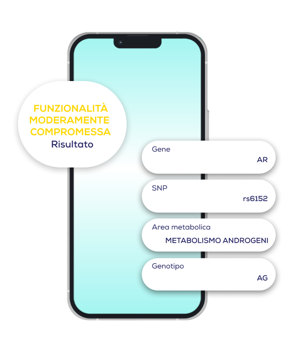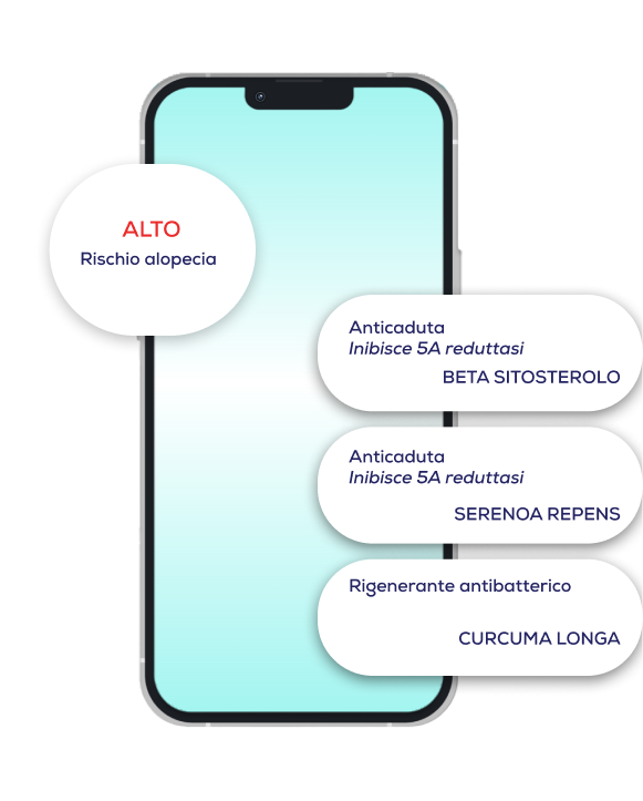Il test fornisce informazioni principi attivi (genocosmetici) idonei per iniziare un percorso di trattamento e prevenzione personalizzato in grado di prevenire e contrastare l’alopecia androgenetica, risolvere le problematiche al cuoio capelluto e mantenere sani e folti i tuoi capelli. Grazie alle informazioni fornite nel report potrai scegliere i prodotti cosmetici più idonei alle tue caratteristiche individuali (genetiche) per un trattamento personalizzato e quindi più efficace.